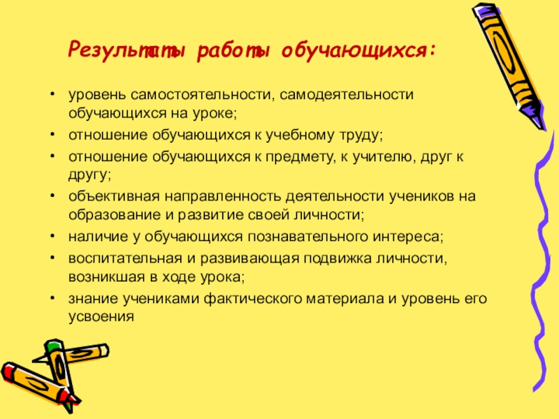 уровень самостоятельности, самодеятельности обучающихся на уроке;