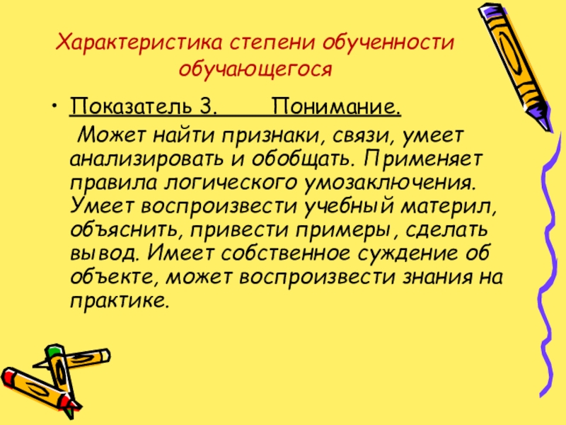 признаки, связи, умеет анализировать и обобщать. Применяет правила логического умозаключения. Умеет воспроизвести учебный материл, объяснить, привести примеры, сделать вывод. Имеет собственное суждение об объекте, может воспроизвести знания на практике.