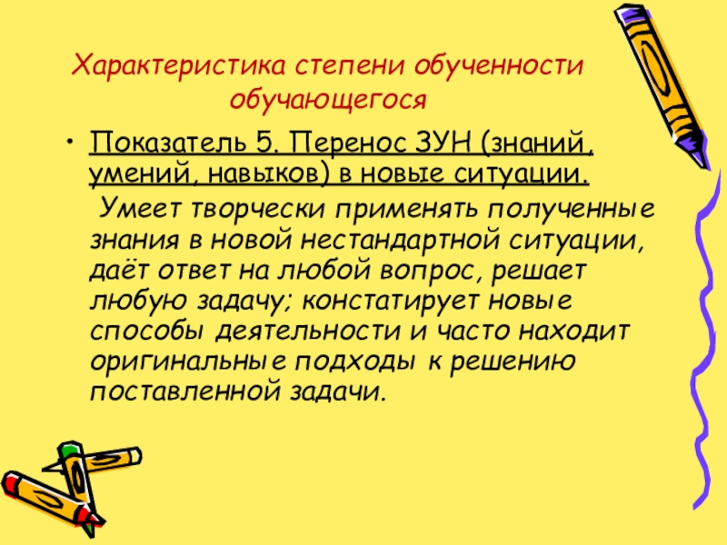 Умеет творчески применять полученные знания в новой нестандартной ситуации, даёт ответ на любой вопрос, решает любую задачу; констатирует новые способы деятельности и часто находит оригинальные подходы к решению поставленной задачи.