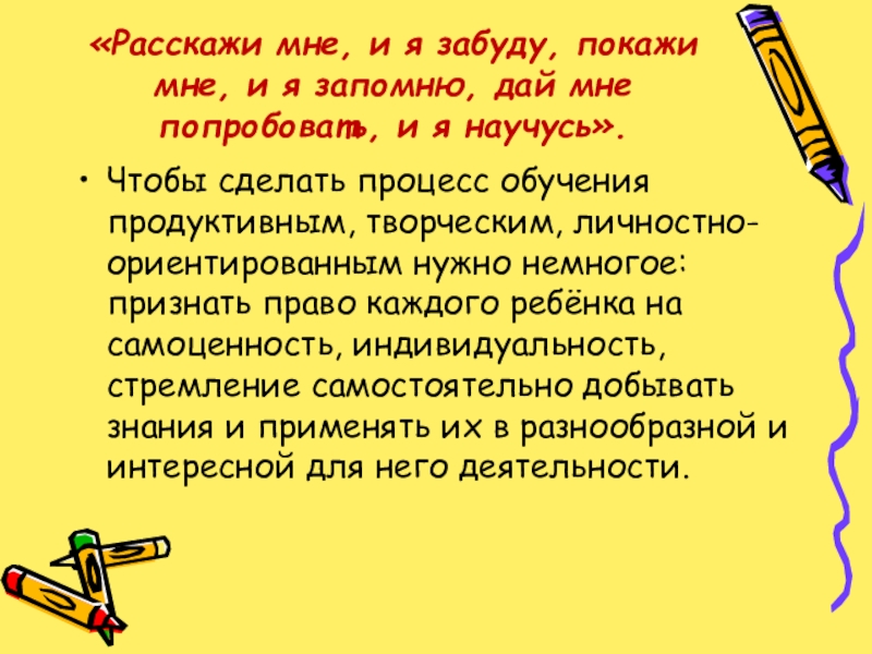 Чтобы сделать процесс обучения продуктивным, творческим, личностно-ориентированным нужно немногое: признать право каждого ребёнка на самоценность, индивидуальность, стремление самостоятельно добывать знания и применять их в разнообразной и интересной для него деятельности.