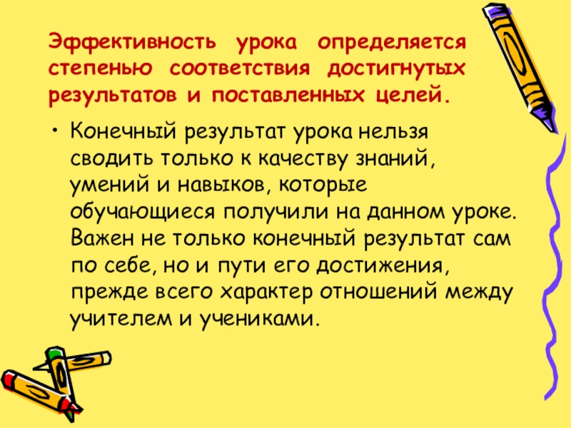 урока нельзя сводить только к качеству знаний, умений и навыков, которые обучающиеся получили на данном уроке. Важен не только конечный результат сам по себе, но и пути его достижения, прежде всего характер отношений между учителем и учениками.