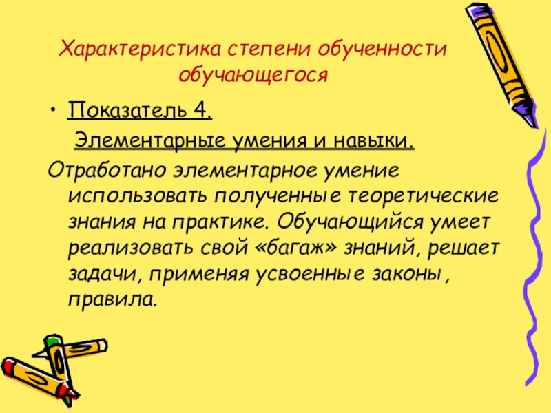 использовать полученные теоретические знания на практике. Обучающийся умеет реализовать свой «багаж» знаний, решает задачи, применяя усвоенные законы, правила.