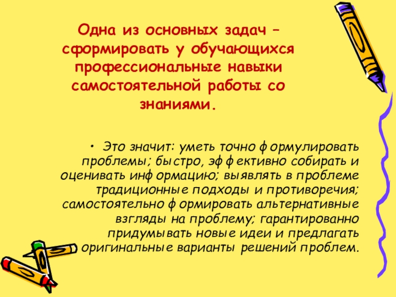 Слайд 44Одна из основных задач – сформировать у обучающихся профессиональные навыки самостоятельной
