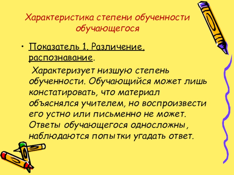 Обучающийся может лишь констатировать, что материал объяснялся учителем, но воспроизвести его устно или письменно не может. Ответы обучающегося односложны, наблюдаются попытки угадать ответ.