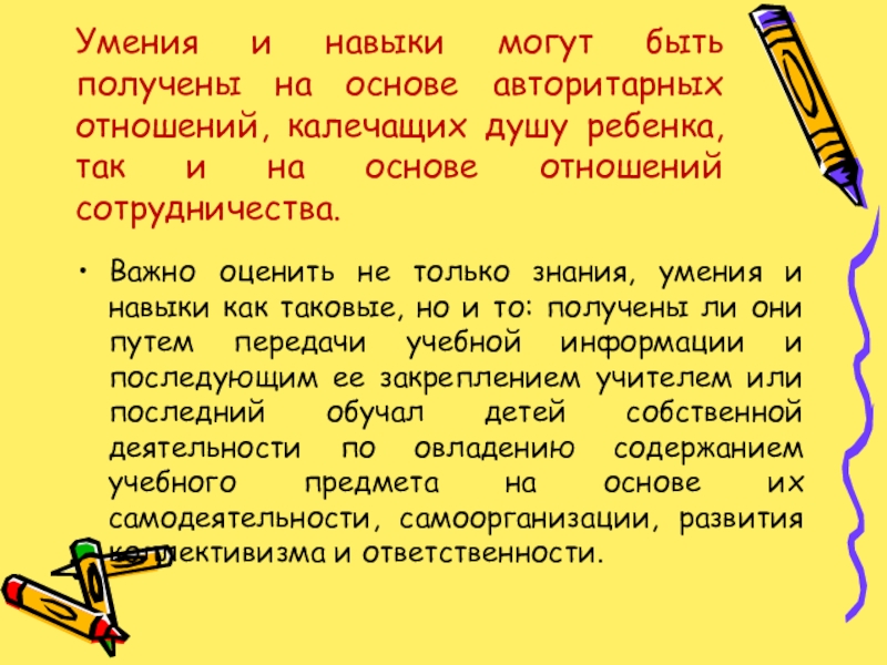 Слайд 30Умения и навыки могут быть получены на основе авторитарных отношений, калечащих