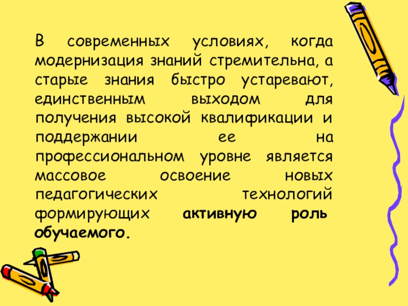 устаревают, единственным выходом для получения высокой квалификации и поддержании ее на профессиональном уровне является массовое освоение новых педагогических технологий формирующих активную роль обучаемого.
