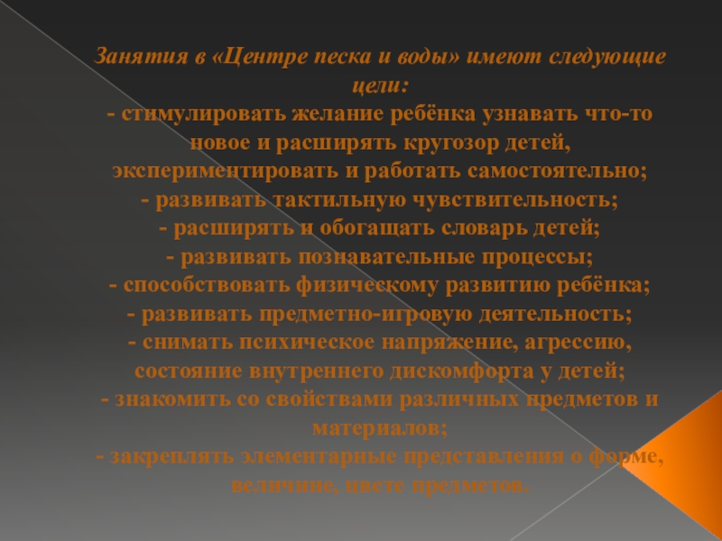 Слайд 4Занятия в «Центре песка и воды» имеют следующие цели: - стимулировать желание