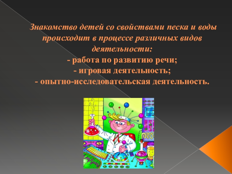 Слайд 6Знакомство детей со свойствами песка и воды происходит в процессе различных
