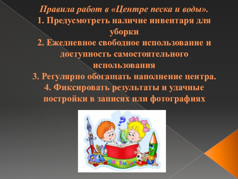 Правила работ в «Центре песка и воды».  1. Предусмотреть наличие инвентаря для уборки  2. Ежедневное