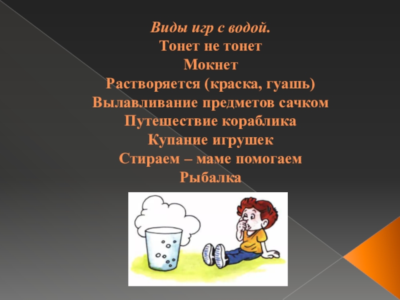Слайд 9Виды игр с водой. Тонет не тонет Мокнет Растворяется (краска, гуашь) Вылавливание предметов сачком Путешествие кораблика Купание