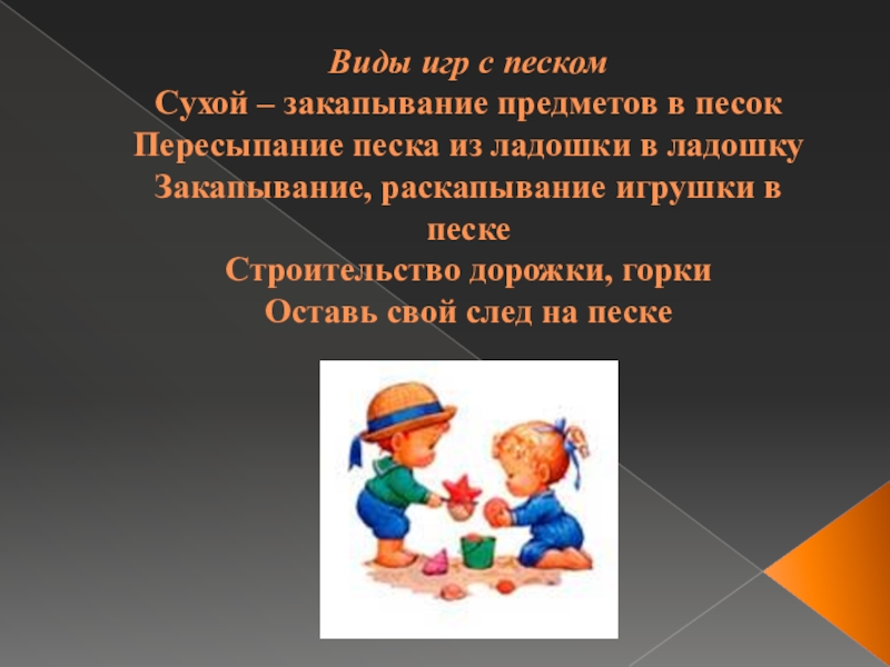 Слайд 8Виды игр с песком Сухой – закапывание предметов в песок Пересыпание песка из