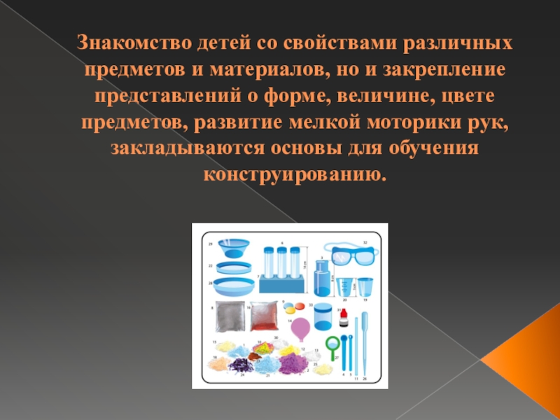 Слайд 3Знакомство детей со свойствами различных предметов и материалов, но и закрепление