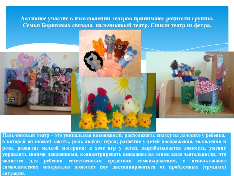 Слайд 18Активное участие в изготовлении театров принимают родители группы.