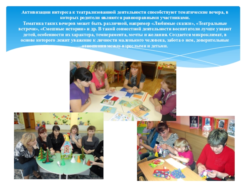 Слайд 20Активизации интереса к театрализованной деятельности способствуют тематические вечера, в которых родители