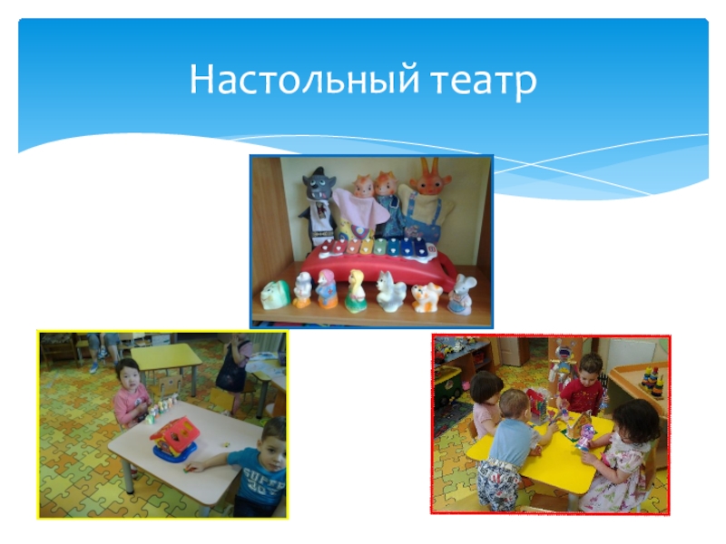 кукол. Здесь есть пальчиковый театр (когда каждая куколка одевается на палец); резиновые куклы (представлены в виде резиновых игрушек); настольный театр (все персонажи, а также некоторые атрибуты сказки, например: избушки, лес, пеньки и др., представлены в виде деревянных фигурок); куклы би-ба-бо (каждая кукла надевается на руку). Также в театральном уголке у нас есть театр масок и различные шапочки с изображением персонажей. Ну и конечно же ширма, которая позволяет сделать кукольный спектакль более интересным.