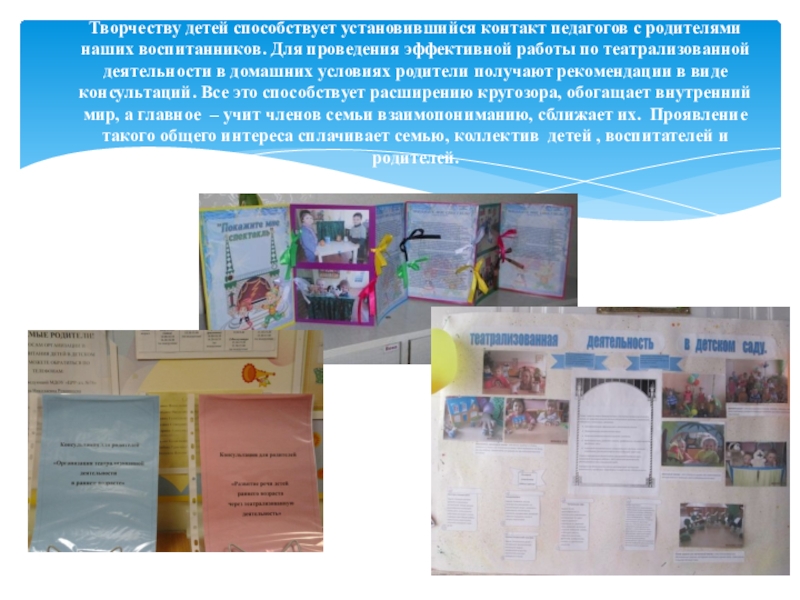 Слайд 19Творчеству детей способствует установившийся контакт педагогов с родителями наших воспитанников. Для