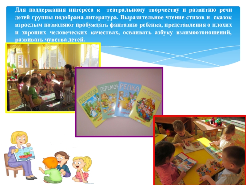 Слайд 17Для поддержания интереса к театральному творчеству и развитию речи детей группы