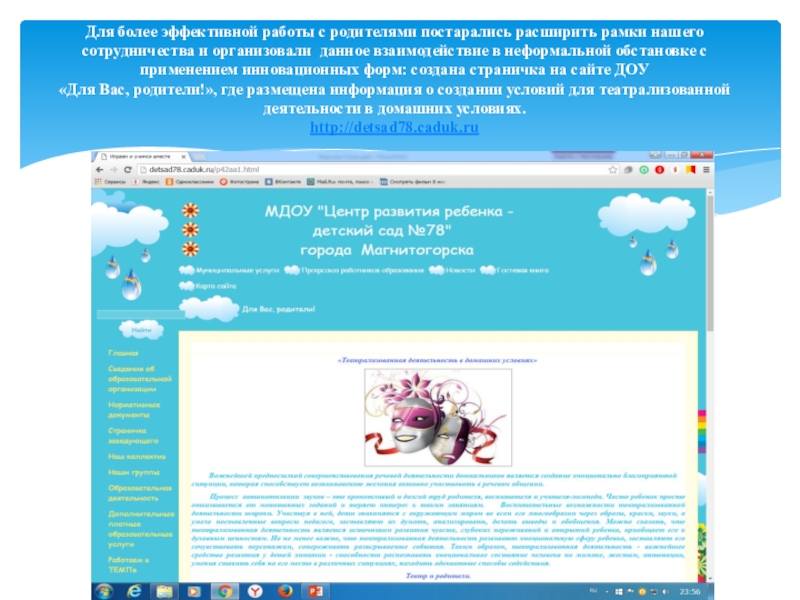«Для Вас, родители!», где размещена информация о создании условий для театрализованной деятельности в домашних условиях.