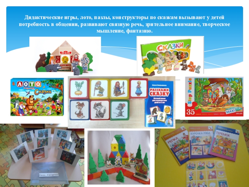 Слайд 15Дидактические игры, лото, пазлы, конструкторы по сказкам вызывают у детей потребность