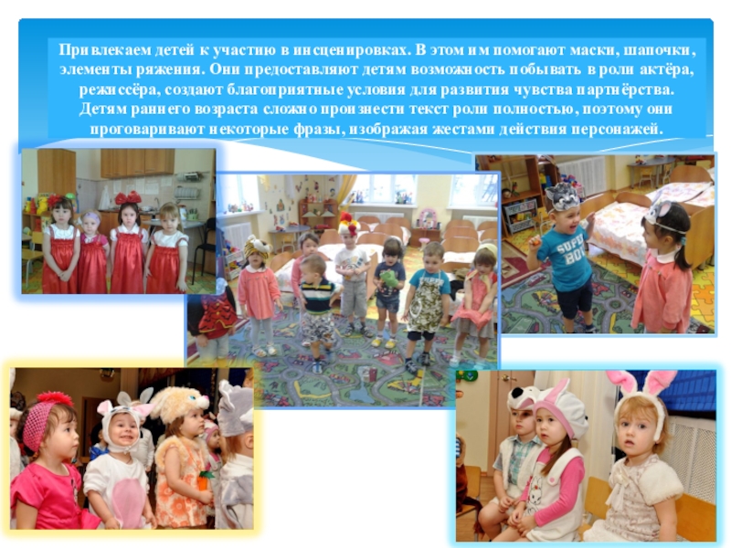 Слайд 12Привлекаем детей к участию в инсценировках. В этом им помогают маски,