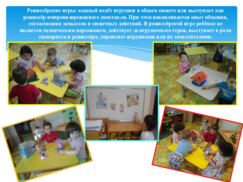 Слайд 5Режиссёрские игры: каждый ведёт игрушки в общем сюжете или выступает как