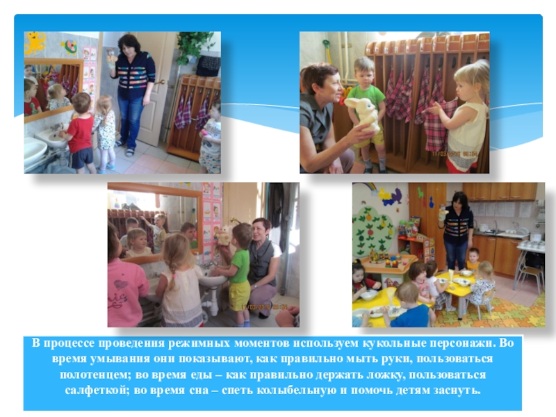 они показывают, как правильно мыть руки, пользоваться полотенцем; во время еды – как правильно держать ложку, пользоваться салфеткой; во время сна – спеть колыбельную и помочь детям заснуть.