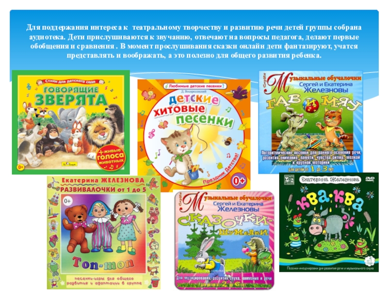 собрана аудиотека. Дети прислушиваются к звучанию, отвечают на вопросы педагога, делают первые обобщения и сравнения . В момент прослушивания сказки онлайн дети фантазируют, учатся представлять и воображать, а это полезно для общего развития ребенка.
