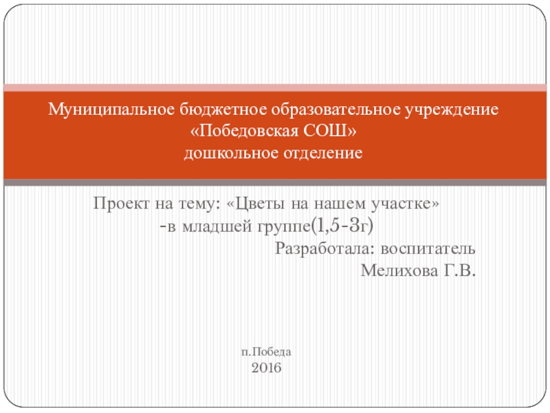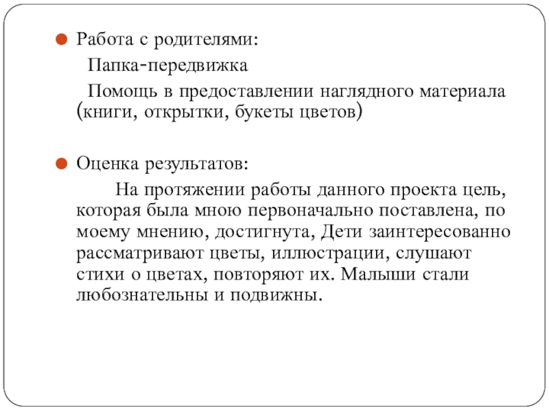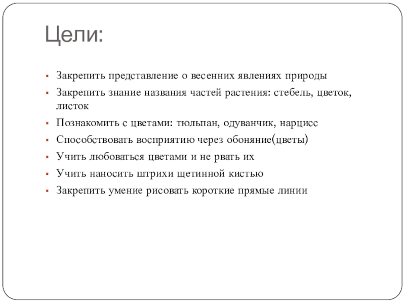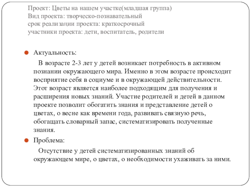 В возрасте 2-3 лет у детей возникает потребность в активном познании окружающего мира. Именно в этом возрасте происходит восприятие себя в социуме и в окружающей действительности. Этот возраст является наиболее подходящим для получения и расширения новых знаний. Участие родителей и детей в данном проекте позволит обогатить знания и представление детей о цветах, о весне как времени года, развивать связную речь, обогащать словарный запас, систематизировать полученные знания.