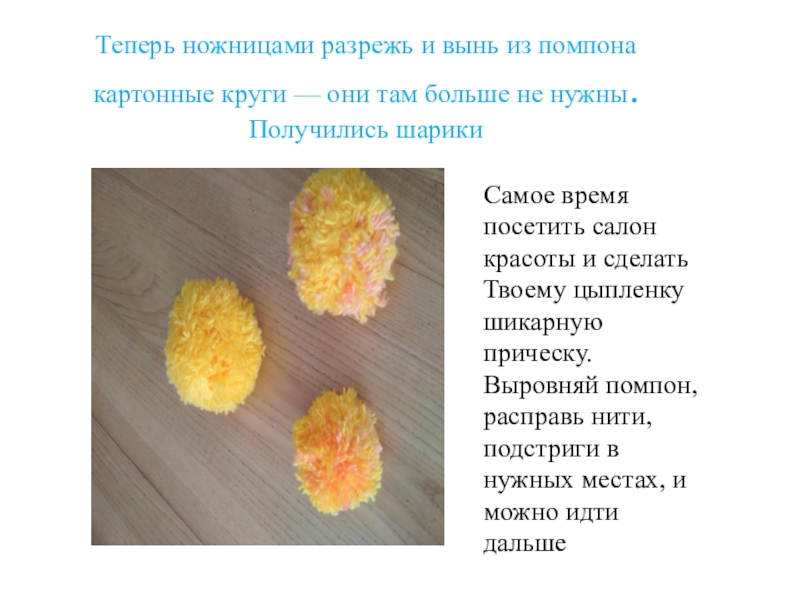 Самое время посетить салон красоты и сделать Твоему цыпленку шикарную прическу. Выровняй помпон, расправь нити, подстриги в нужных местах, и можно идти дальше