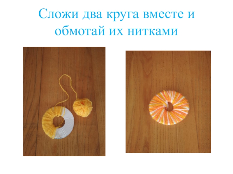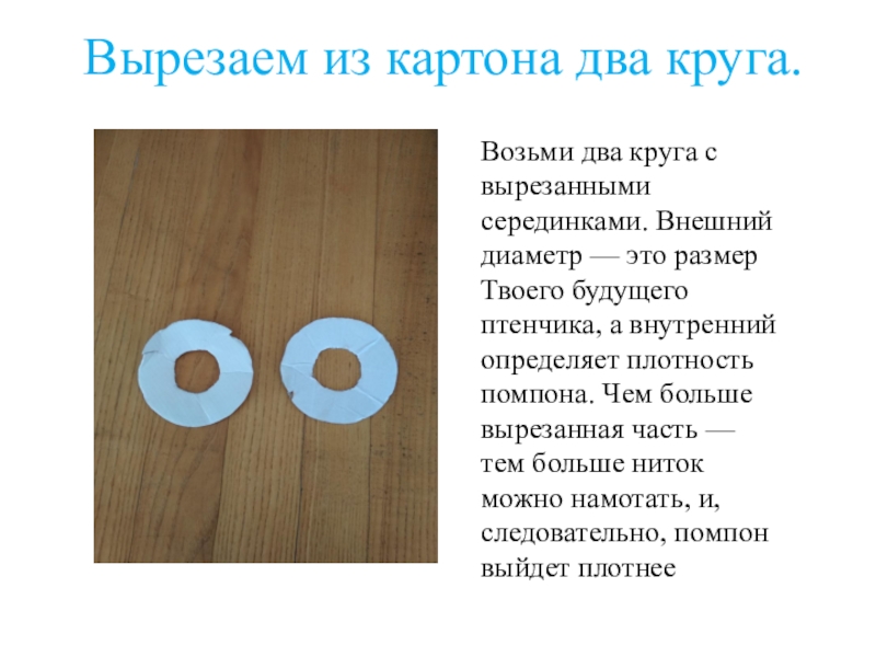 Возьми два круга с вырезанными серединками. Внешний диаметр — это размер Твоего будущего птенчика, а внутренний определяет плотность помпона. Чем больше вырезанная часть — тем больше ниток можно намотать, и, следовательно, помпон выйдет плотнее