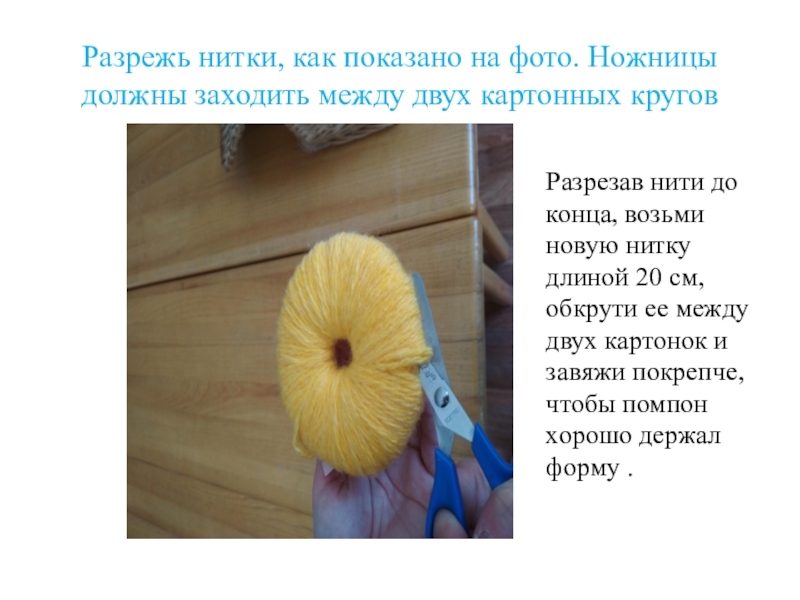 Разрезав нити до конца, возьми новую нитку длиной 20 см, обкрути ее между двух картонок и завяжи покрепче, чтобы помпон хорошо держал форму .