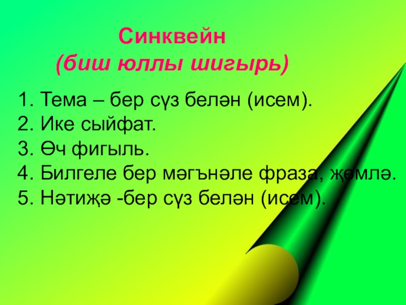 Синквейн (биш юллы шигырь)1. Тема – бер сүз белән (исем).2. Ике сыйфат.3. Өч фигыль.4. Билгеле бер мәгънәле