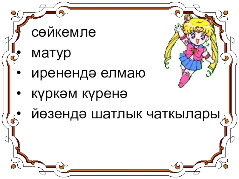 сөйкемле матур иренендә елмаю күркәм күренә йөзендә шатлык чаткылары