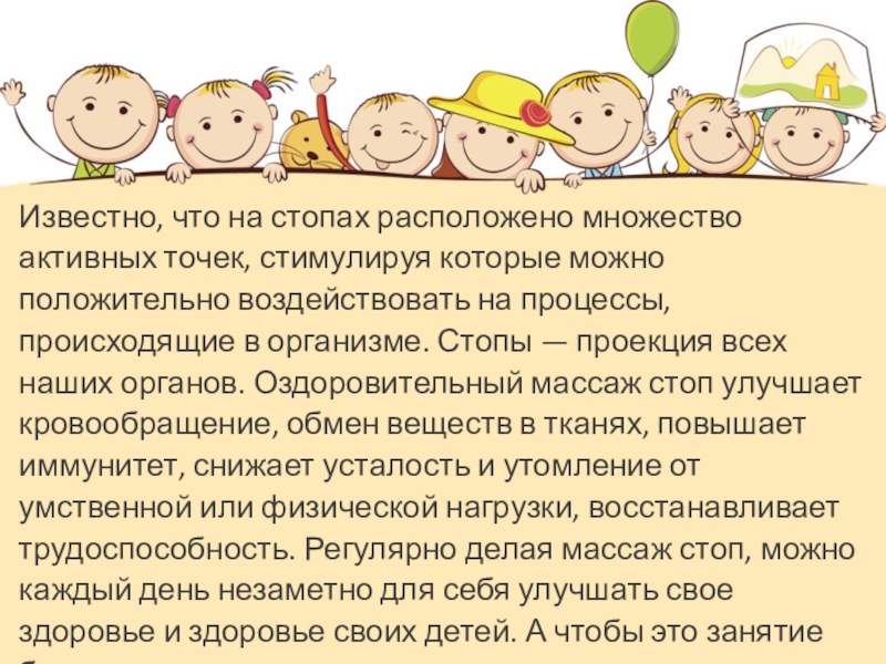 Слайд 3Известно, что на стопах расположено множество активных точек, стимулируя которые можно