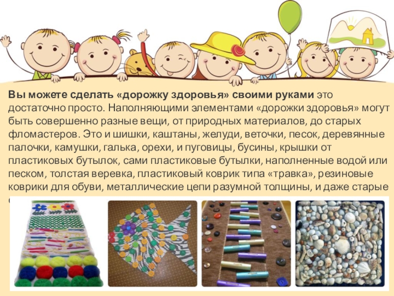 Слайд 5Вы можете сделать «дорожку здоровья» своими руками это достаточно просто. Наполняющими