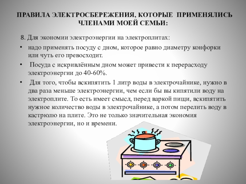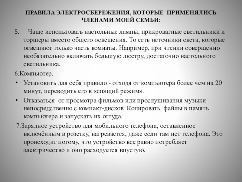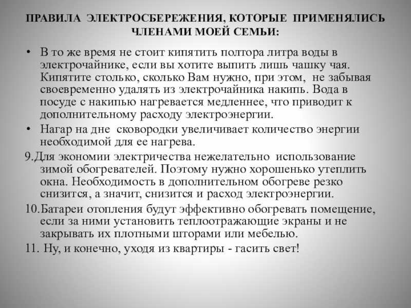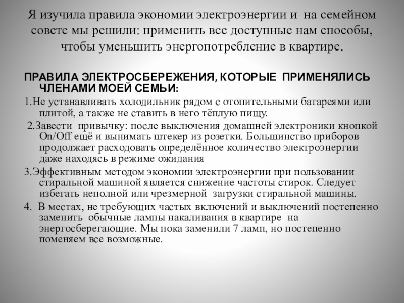 Слайд 14ПРАВИЛА ЭЛЕКТРОСБЕРЕЖЕНИЯ, КОТОРЫЕ ПРИМЕНЯЛИСЬ ЧЛЕНАМИ МОЕЙ СЕМЬИ: