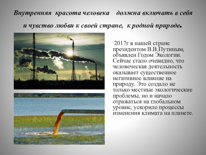 2017г в нашей стране президентом В.В.Путиным, объявлен Годом Экологии. Сейчас стало очевидно, что человеческая деятельность оказывает существенное негативное влияние на природу. Это создало не только местные экологические проблемы, но и начало отражаться на глобальном уровне, ускорило процессы изменения климата на планете.