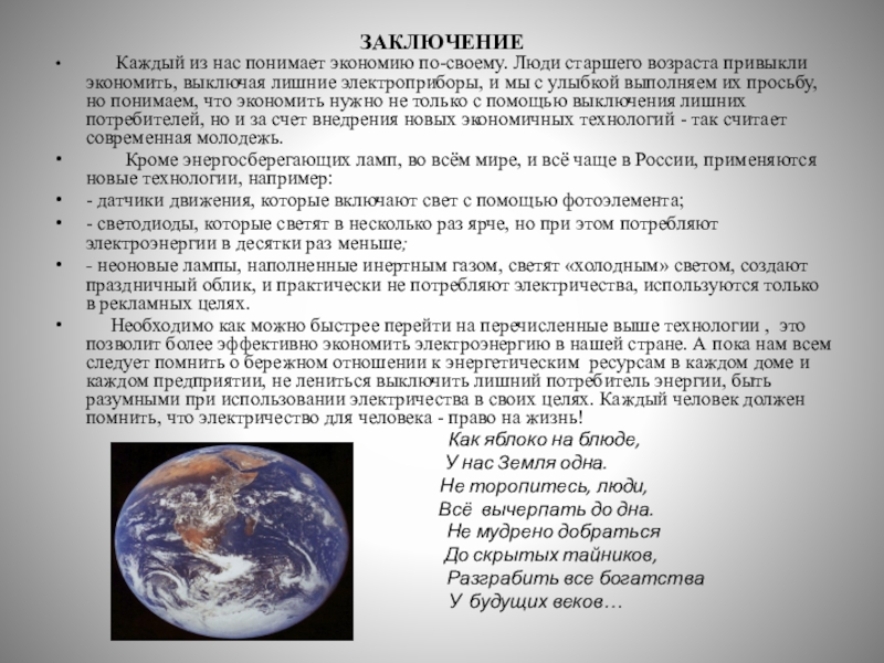 Необходимо как можно быстрее перейти на перечисленные выше технологии , это позволит более эффективно экономить электроэнергию в нашей стране. А пока нам всем следует помнить о бережном отношении к энергетическим ресурсам в каждом доме и каждом предприятии, не лениться выключить лишний потребитель энергии, быть разумными при использовании электричества в своих целях. Каждый человек должен помнить, что электричество для человека - право на жизнь!