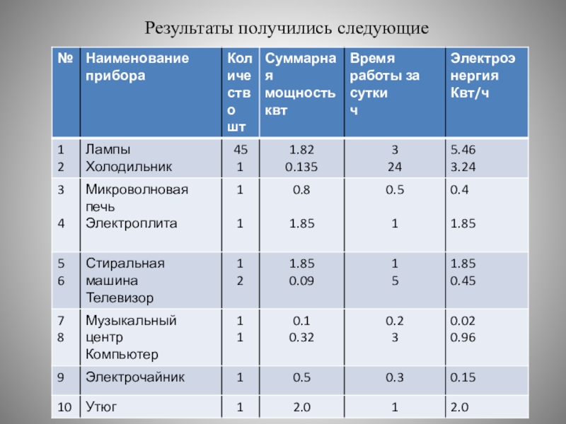 родителями я составила таблицу, в которую внесла все электрические приборы, используемые дома и посчитала количество израсходованной энергии. Израсходованная энергия рассчитывалась так: