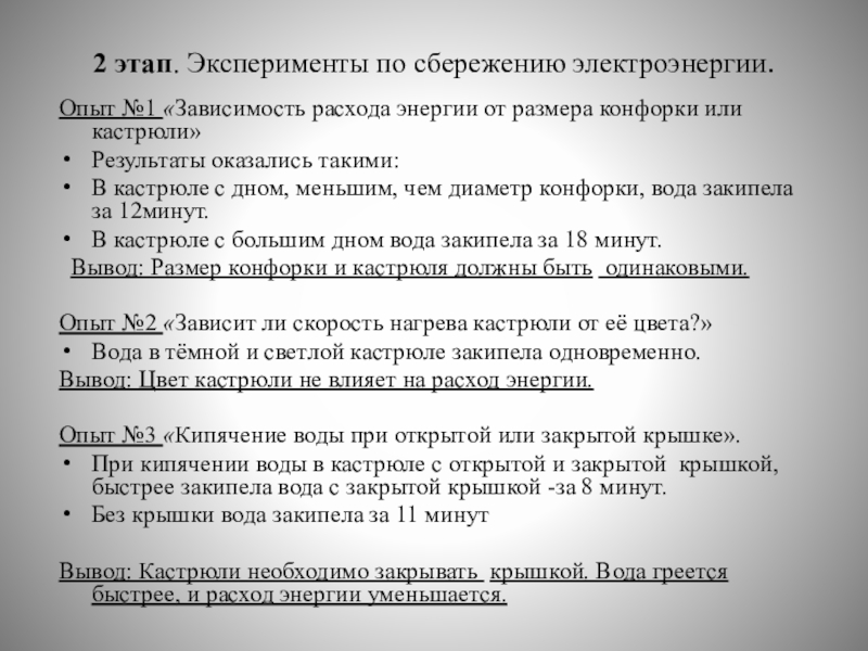 Слайд 112 этап. Эксперименты по сбережению электроэнергии.