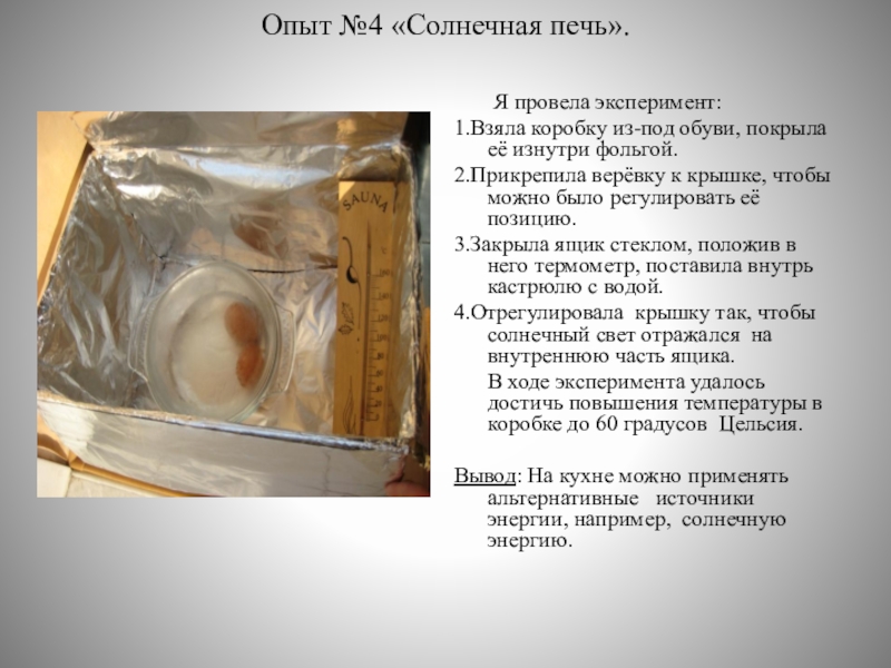 Вывод: На кухне можно применять альтернативные источники энергии, например, солнечную энергию.
