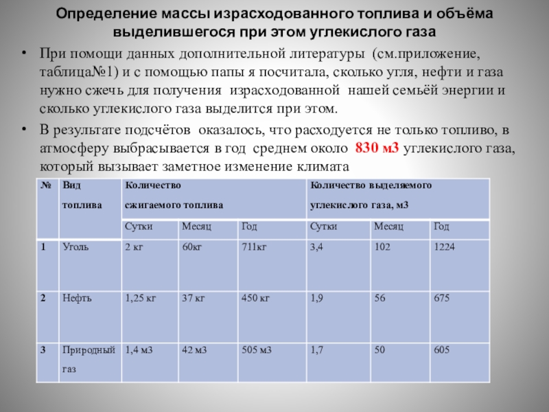 помощи данных дополнительной литературы (см.приложение, таблица№1) и с помощью папы я посчитала, сколько угля, нефти и газа нужно сжечь для получения израсходованной нашей семьёй энергии и сколько углекислого газа выделится при этом.