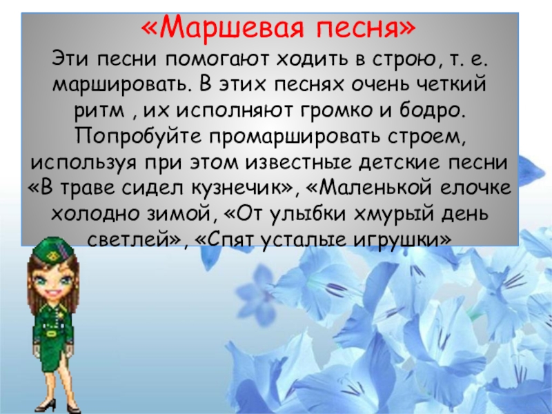 «Маршевая песня» Эти песни помогают ходить в строю, т. е. маршировать. В этих песнях очень четкий