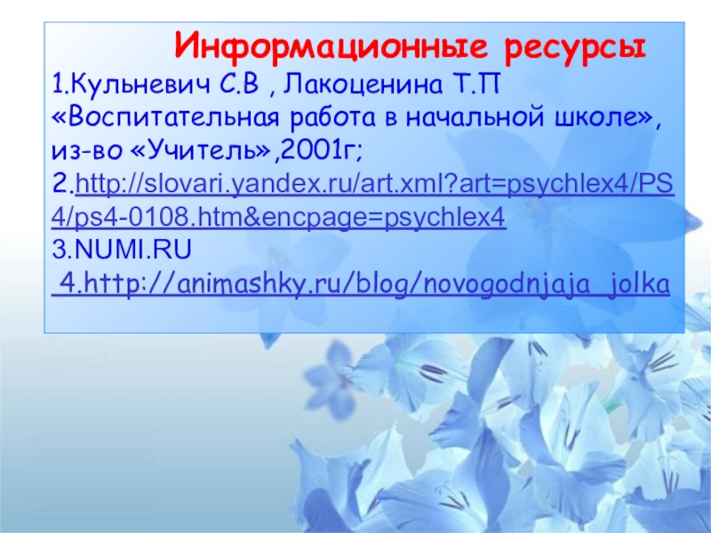 работа в начальной школе»,из-во «Учитель»,2001г; 2.http://slovari.yandex.ru/art.xml?art=psychlex4/PS4/ps4-0108.htm&encpage=psychlex4 3.NUMI.RU 4.http://animashky.ru/blog/novogodnjaja_jolka
