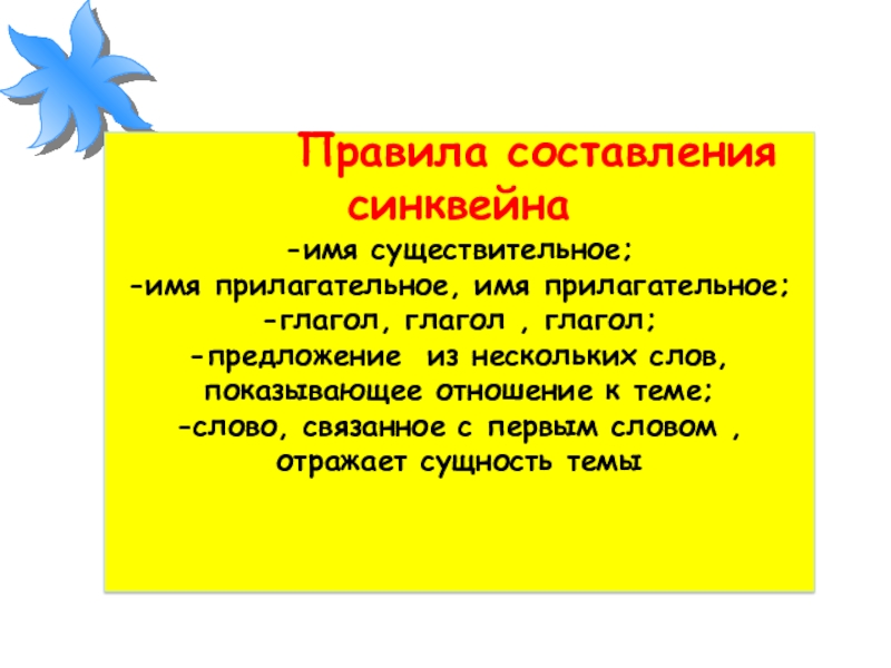 Правила составления       синквейна -имя существительное; -имя прилагательное,