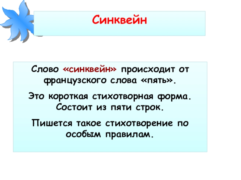 СинквейнСлово «синквейн» происходит от французского слова «пять». Это короткая стихотворная форма. Состоит из пяти строк.Пишется такое стихотворение