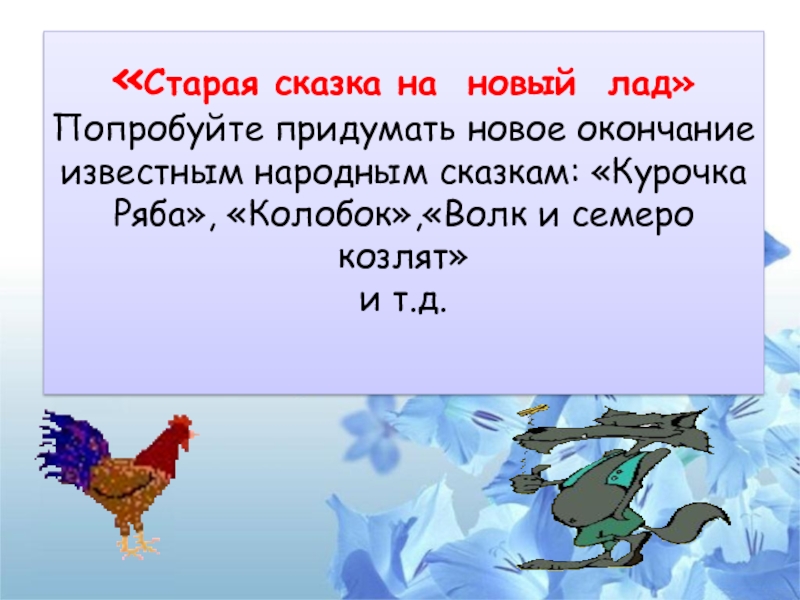 Слайд 5«Старая сказка на новый лад» Попробуйте придумать новое окончание известным народным сказкам: