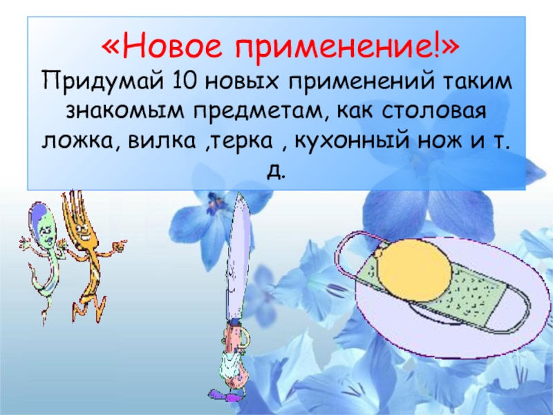 «Новое применение!» Придумай 10 новых применений таким знакомым предметам, как столовая ложка, вилка ,терка , кухонный
