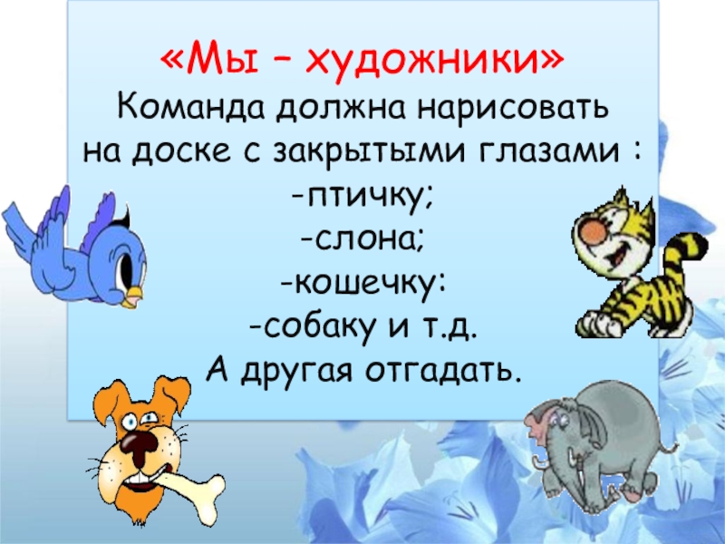 Слайд 9«Мы – художники» Команда должна нарисовать на доске с закрытыми глазами : -птичку; -слона; -кошечку: -собаку