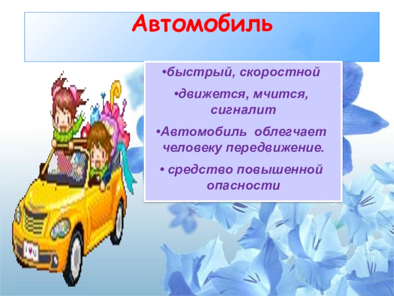 Автомобиль быстрый, скоростнойдвижется, мчится, сигналитАвтомобиль облегчает человеку передвижение. средство повышенной опасности